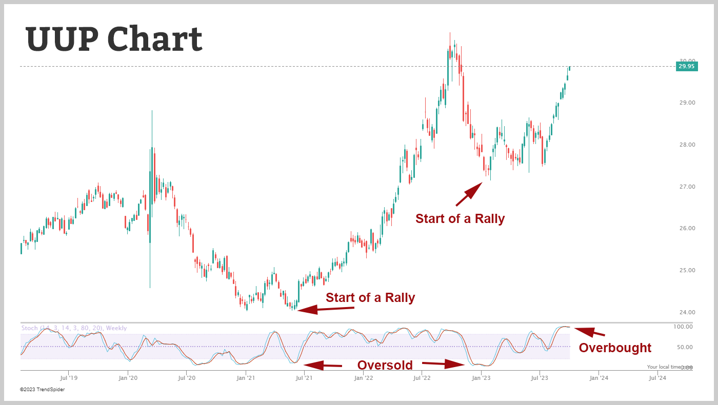 On the other hand, when an asset is oversold (below 20), it means that the selling pressure may have peaked and offers a good chance to close out short holdings or start new long ones.