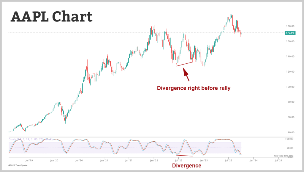 A bearish divergence, on the other hand, appears when prices make higher highs while the stochastic indicator makes lower highs. It suggests that purchasing pressure is waning, which can portend a bullish turn in the price trend.