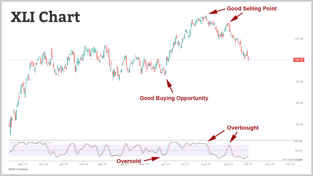The Stochastic Indicator can be used to determine exit points in addition to serving as an entry signal. A smart moment to take profits or think about closing long holdings is when an asset hits an overbought condition (over 80), which signals that there may be little upside potential left.