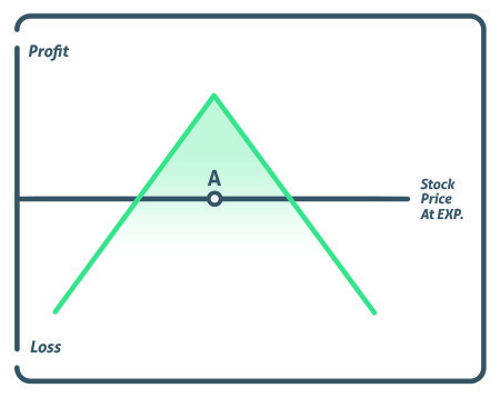 A short straddle consists of selling a call and a selling a put with the same underlying security, strike price, and expiration date. Point A represents this strike price on the chart below. With a short straddle, credit is received and profits when the stock stays in a narrow range. The profit opportunity of a short straddle is limited to the total premiums received. This strategy works best when the stock has little movement until the expiration.