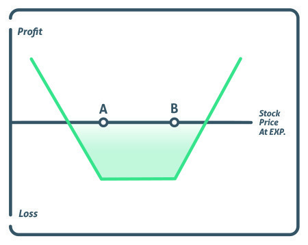 The long strangle (buying the strangle) is a neutral options strategy with limited risk and unlimited profit potential. It is performed by buying a lower strike price put, represented by point A, and buying a higher strike price call, represented by point B. The strategy is best used in highly volatile markets where a significant price move in the stock is expected, but unsure of the direction of the large move. Such scenarios might include company earnings or big announcement.